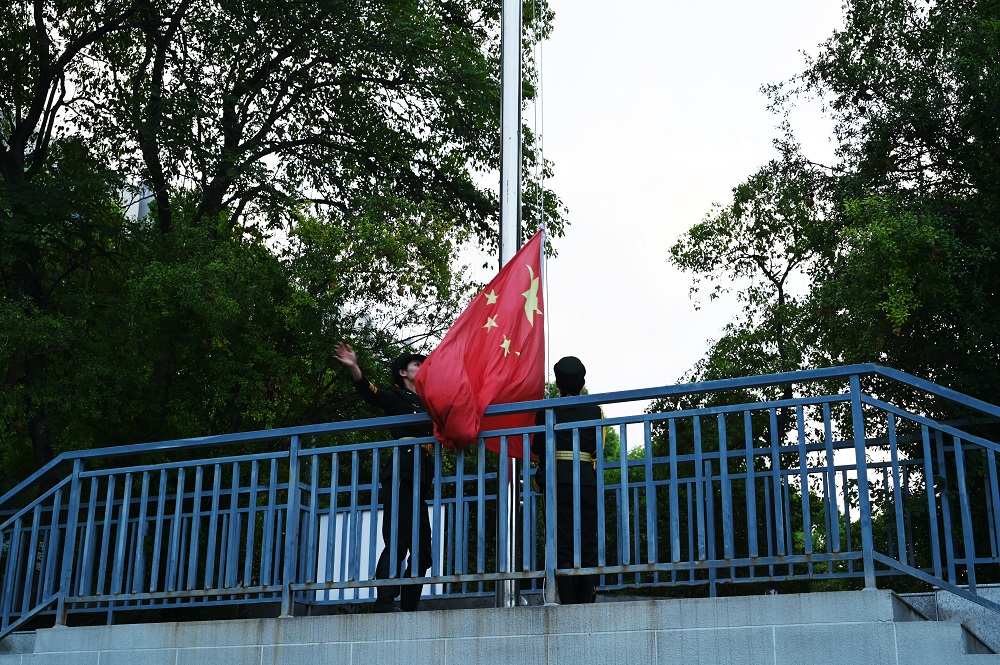 在铿锵激昂的国歌声中,鲜艳的五星红旗冉冉升起,全体师生庄严肃立,面向国旗行注目礼,齐声高唱国歌,向伟大祖国表达崇高的敬意。