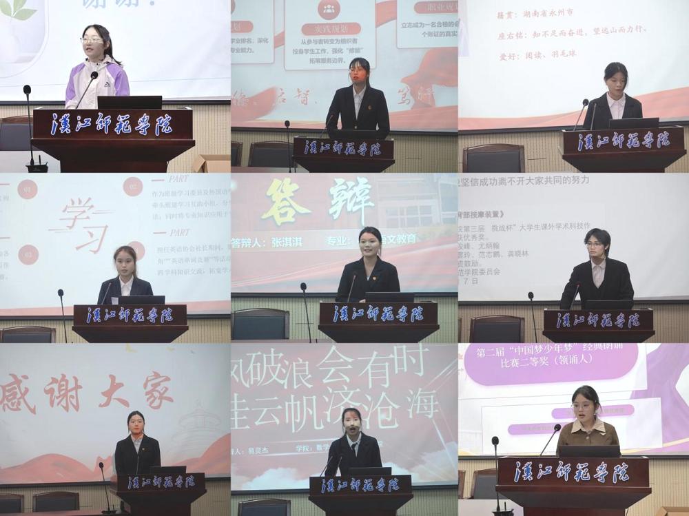 答辩现场,九位候选人通过PPT展示和现场答辩,全面汇报了个人在学业、思想品德、社会实践等方面的突出事迹。选手们自信从容的表现和积极向上的精神风貌,赢得现场阵阵掌声。