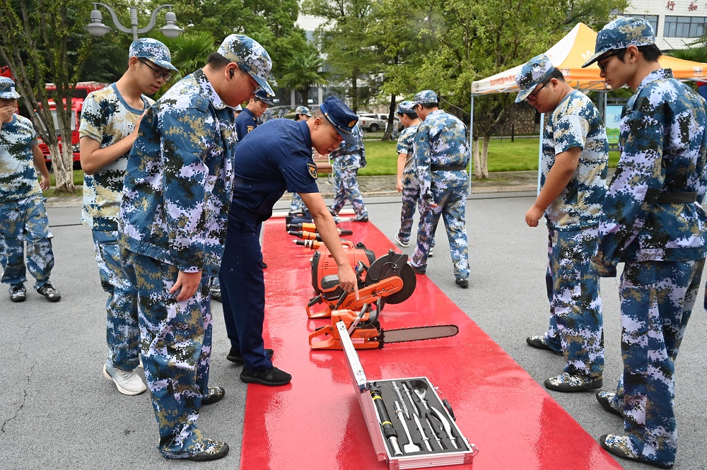 在消防器材展示区,集中展示了灭火器、消防水带、防毒面具、破拆工具等多种常见消防器材与专业救援装备。消防员耐心细致地讲解了各种器材的功能、使用方法及适用场景,并进行了现场操作演示。